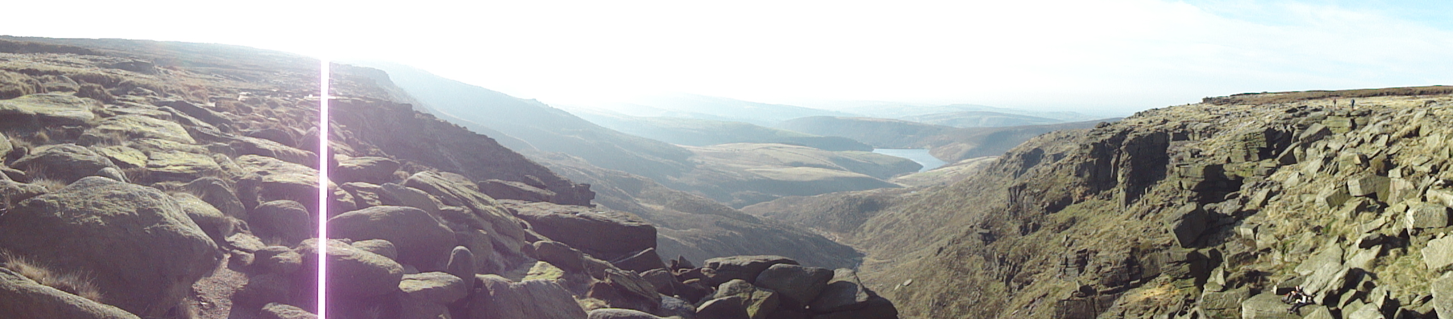Walk round the edge for about a mile and a half. This is very easy walking along a good path threading between gritstone formations, with views of the reservoir below and beyond. You will soon reach Kinder Downfall, the highest waterfall in the Peak District, where the river Kinder spills over the plateau down a tumble of gritstone rocks to the reservoir. Whilst not perhaps the most spectacular torrent on the planet, it looks impressive on a blustery day, when the water seems to blow back up on itself. The banks of the river make a good place to stop for lunch.