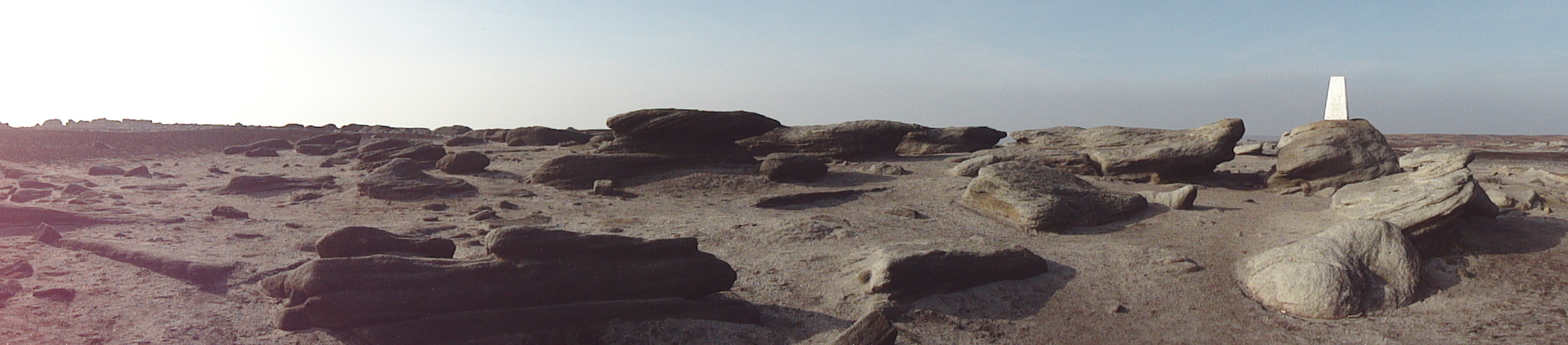 After lunch, cross the river and carry on along the path for another couple of miles or so until you reach the trig point at Kinder Low, set amidst a peaty, somewhat alien landscape with its quasi-lunar rocky outcrops. Here you have good views of the southern ridges and yet more gritstone formations. From this point, my navigation becomes even more sketchy, but basically you carry on in roughly the same direction, keeping to the left of the rocks, until you reach a paved path which takes you past what I think is Noe Stool to a crossroads with the paths leading up from Jacob’s ladder/Upper Booth/Edale. Turn right through a gate, and follow the pony track for a while, passing the medieval Edale cross.