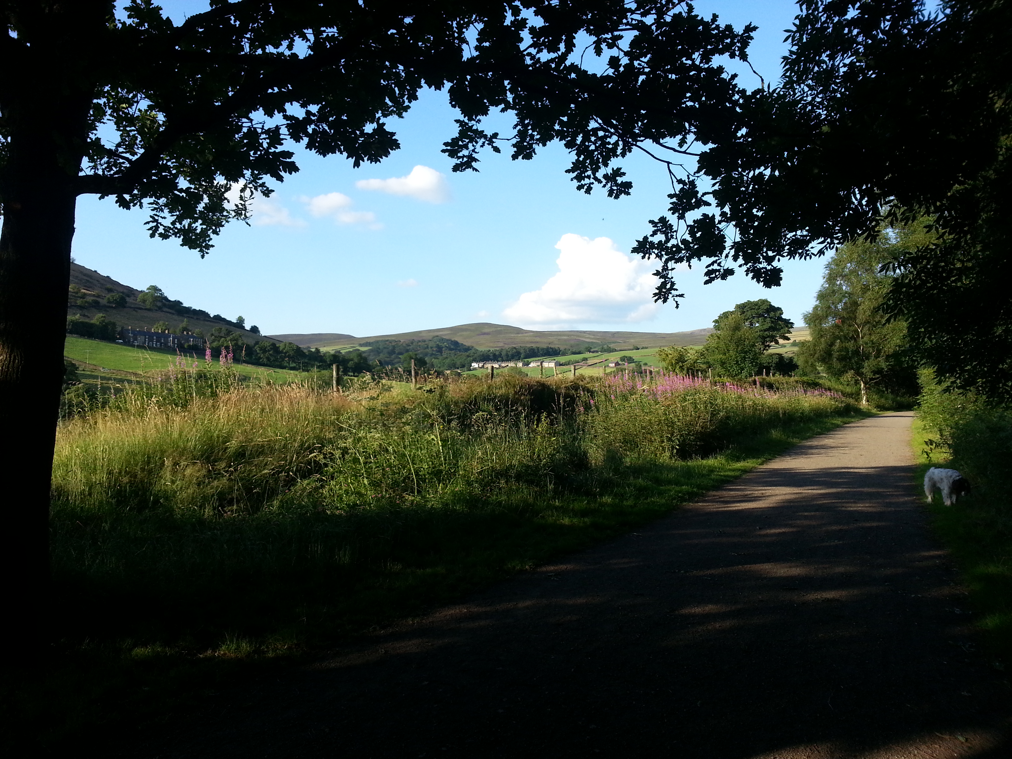 This evening, the Nipper (ensconced in pram), the Dog and I took a stroll down the Sett Valley trail. This is a disused railway line converted into a pleasant flat path between Hayfield and New Mills, very pram friendly (though watch out for cyclists if your dog, like ours, insists on walking at an angle of 45 degrees and crossing the path of every other living being on the same route). We walked from Hayfield to Birch Vale and back, which is about 2 miles/40 minutes, and very pleasant it was too, with lovely views of Lantern Pike, Middle Moor, Twenty Trees and Birch Vale reservoir in the evening sun. The Nipper didn’t even shout until we got home. Bliss, apart from rabid jealousy of people sitting outside the Royal in Hayfield having an evening pint.