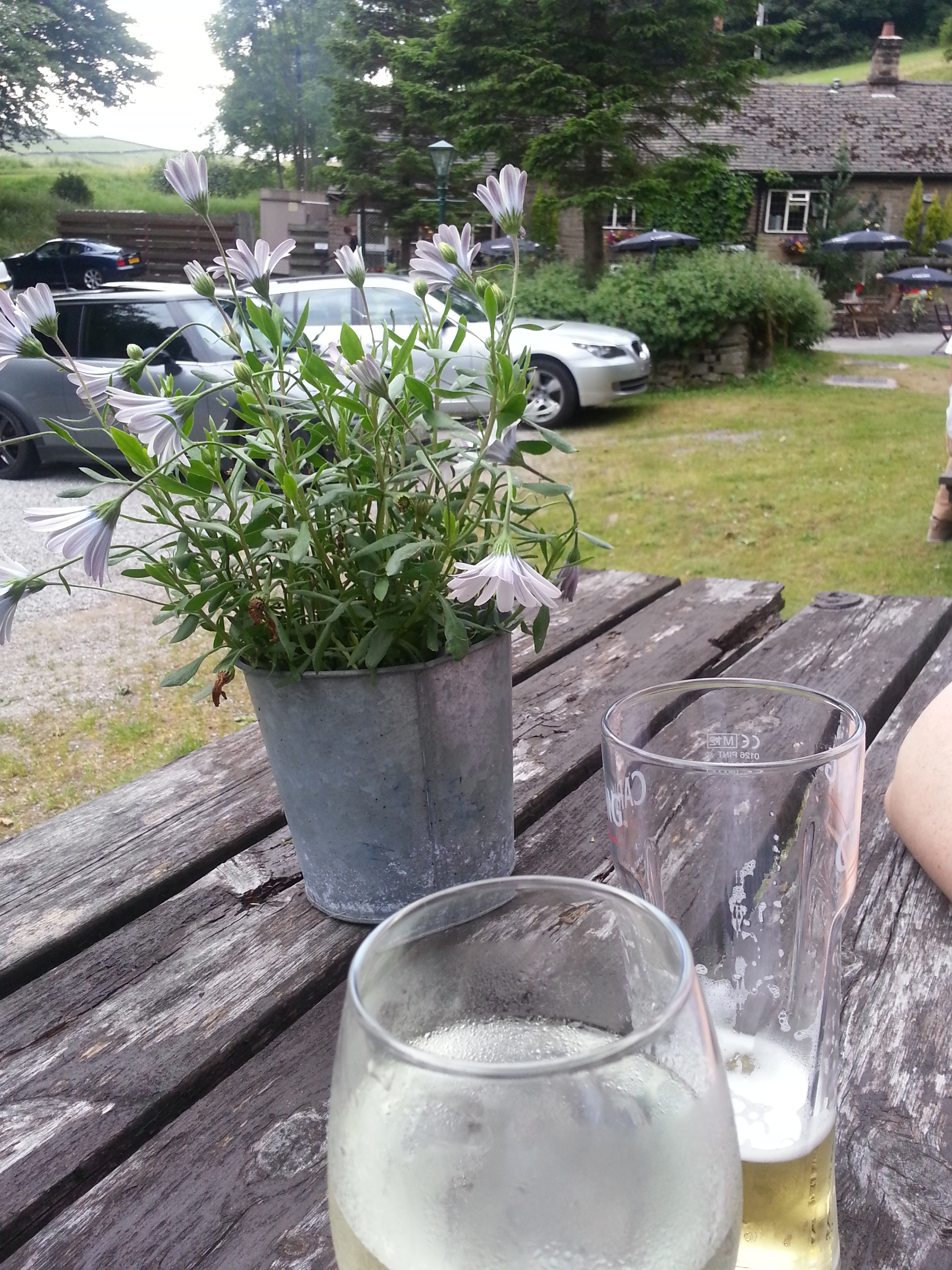 Afterwards we planned to stop off at the Old Hall Inn in Chinley for a little pre-prandial refreshment, but it was heaving, so we called in at the Lamb instead, where we sat outside quite happily as the clouds drew in, and the Nipper enjoyed his first pub experience, although I’m embarrassed to say he did so without any trousers on. I fear this may have been poor parenting.
